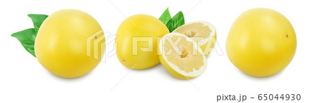 pomelo with slice and leaf isolated on white background. Set or collection.