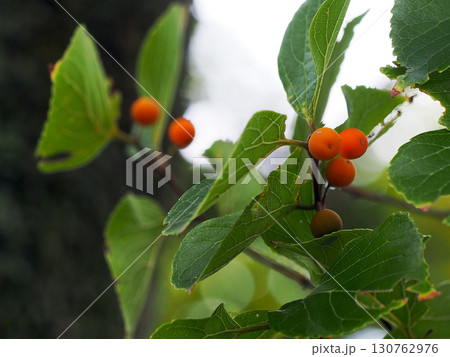 朝の日差しを浴びたエノキの葉っぱとオレンジ色の実(色付き始めた実をつけた榎の樹)