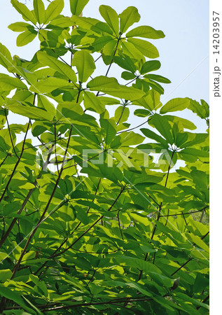 輪生状の大きな葉の中に実が付いた落葉高木のホオノキ