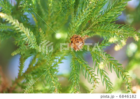 白背景に杉の枝とスギの雌花の写真素材