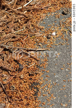 杉花粉症のアレルゲン・一夜にして大風に散り敷いた杉の雄花と雌花・縦位置