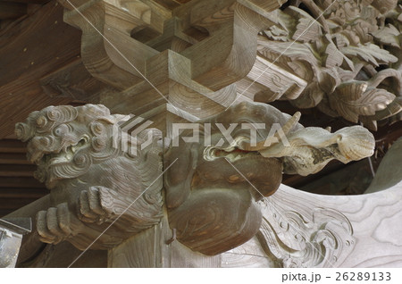 信州 安曇野 池田町の渋田見諏訪神社 大隅流の彫刻が見事な江戸時代の本殿 向拝の獅子と獏の彫刻
