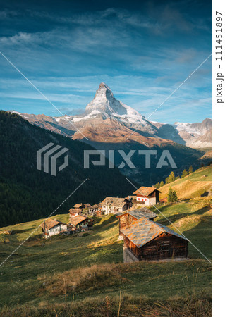 Landscape of Matterhorn iconic mountain with rustic village on hill in Findeln, Switzerland