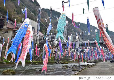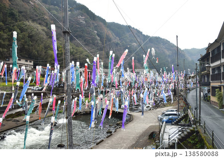 杖立温泉の美しい鯉のぼり 杖立温泉の河川敷 (熊本県小国町)