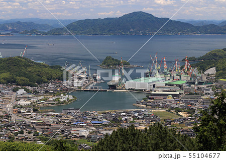 波止浜湾、波止浜港から来島、大三島などの芸予諸島を望む