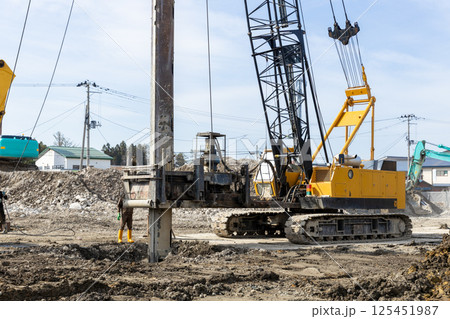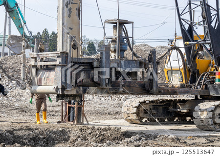 解体工事現場 杭抜き作業中の作業員とオーガ