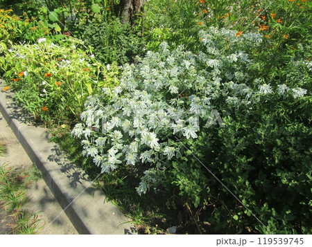 こじま花の会花畑に咲く初雪草と百日草とノゲイトウ