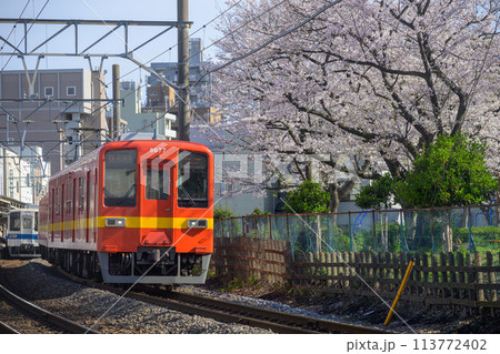 公園の桜並木と東武亀戸線の電車 リバイバルカラー(赤色)