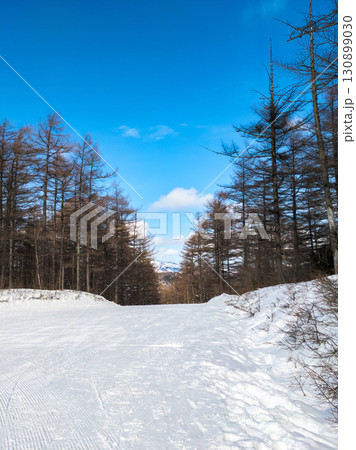 圧雪跡が残る広く閑静な晴天のゲレンデ (長野県/東御市、群馬県/嬬恋村、湯の丸高原)