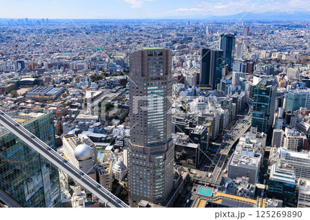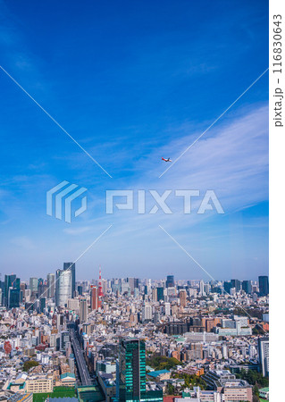 【東京都】渋谷から眺める東京都市風景(地上のビルと空の飛行機)