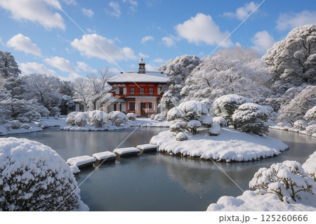 小石川植物園、日本庭園から見た総合研究博物館小石川分館(1月)東京都文京区