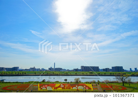 都市農業公園の河川敷に咲くカラフルなチューリップ畑