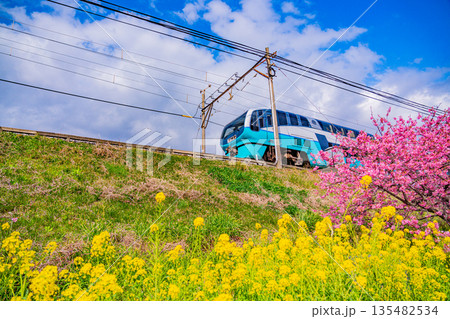 (静岡県)満開の河津桜並木と伊豆急行電車