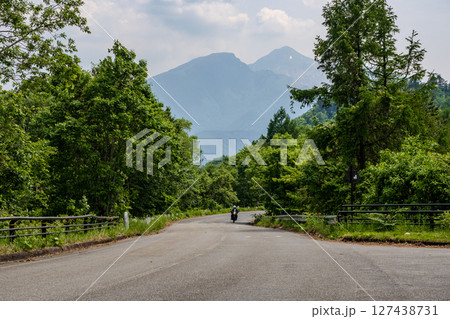 磐梯吾妻レークラインの三湖パラダイス付近を走るオートバイ