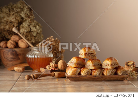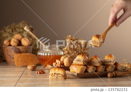 Baklava with walnuts and honey on a beige background.