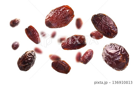 Dried dates levitate on a white background