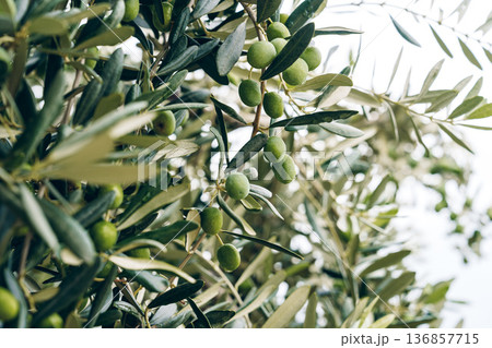 Olive tree with unripe olives in a bright outdoor setting during the day