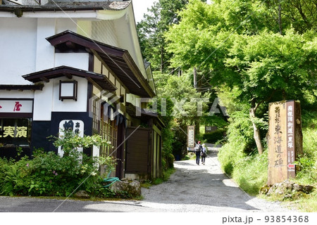 箱根町畑宿 畑の茶屋と箱根路東海道の碑と新緑とハイカー