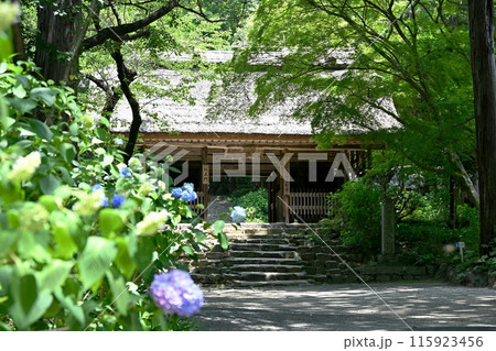 アジサイ咲く阿弥陀寺の仁王門(山口県防府市)