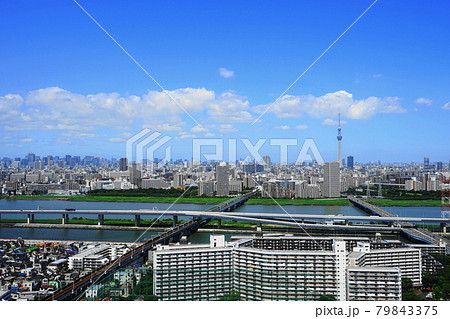 日本の東京都市景観 荒川やボートレース江戸川(画面右付近)などを望む(左に東京スカイツリー)