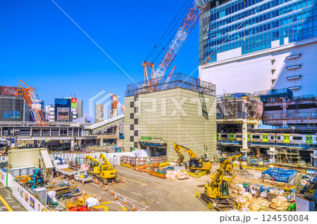 日本の東京都市景観広大な空間が…重機が集結。夏のような空が広がる…さよなら渋谷駅西口…
