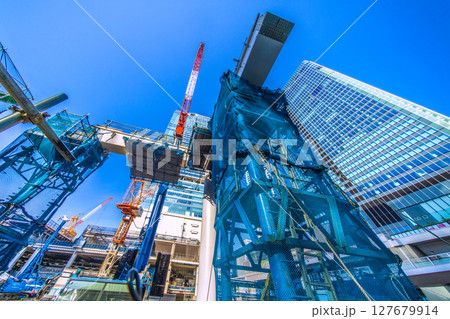 日本の東京都市景観右に向いたクレーン、重機が集結。夏のような空が広がる…さよなら渋谷駅西口…=21日