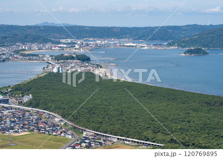佐賀県唐津市 鏡山展望台から眺める唐津城と唐津湾と虹の松原