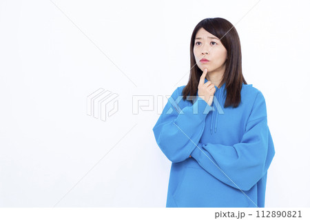 白い背景の前で腕組みをして悩んでいる30代の女性