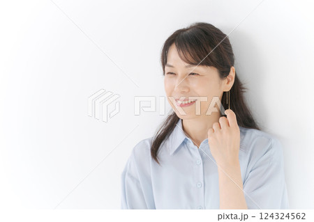 白い背景の前で笑顔でスマホを持っている30代の女性