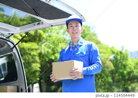 屋外で荷物を運ぶ困り顔の女性の配送ドライバー