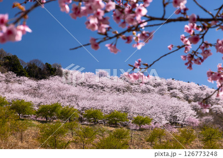 埼玉県秩父郡東秩父村坂本 山一面を桜が覆う「虎山の千本桜」満開のソメイヨシノ並木