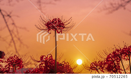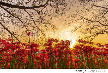 「埼玉県」見沼田んぼに咲く彼岸花を黄昏時に望む