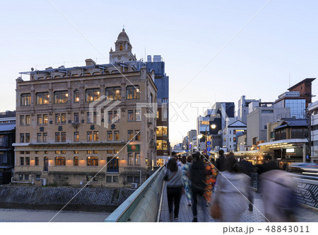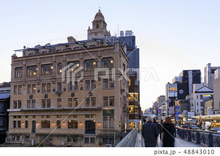京都のまちなみ 四条大橋からの景色 南側東華菜館等を望む レトロモダン建築
