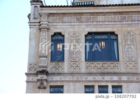 京都のまちなみ 四条河原町 東華菜館 正面四条通り側の最上階4階の窓部 レトロモダン建築