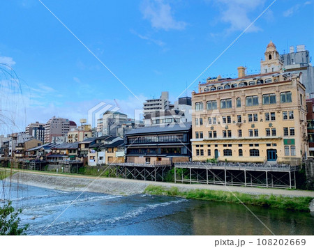 京都のまちなみ 四条大橋からの景色 南側東華菜館等を望む レトロモダン建築 縦アングル