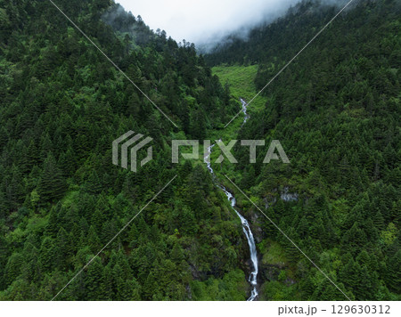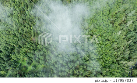 Aerial view of forest landscape in fog and rain