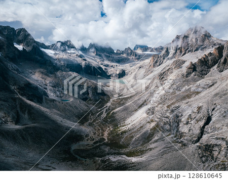 Aerial view of beautiful lake in high altitude mountains landscape