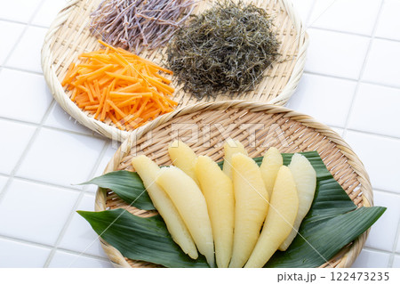 カズノコ、 根布、スルメ、人参、松前漬けの材料