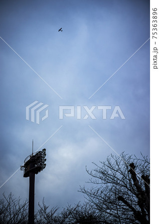 大阪府松原市 天美西公園の照明塔と冬の空を飛ぶ飛行機(アニメ風背景素材・コピースペース)