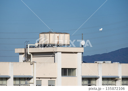 大阪府松原市 天美西小学校の屋上給水タンクと青空を飛ぶ白鷺(アニメ風・コピースペース)