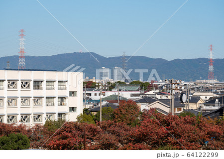 松原市立天美西小学校と生駒山、秋の紅葉と住宅街が広がる街並み(アニメ風・コピースペース)