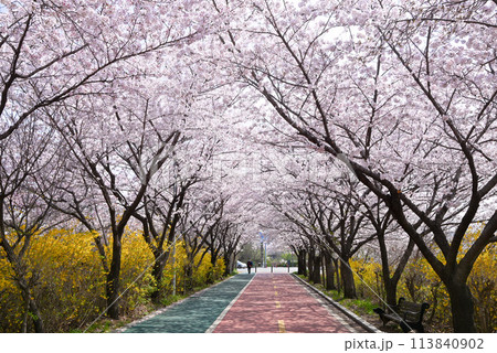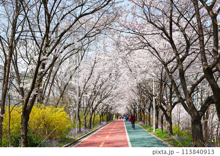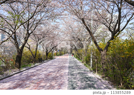 桜並木が続くサイクリングロードと遊歩道【韓国ソウル】