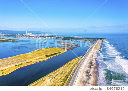 松川浦大橋と青空に映える港の風景