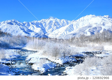 冬の白馬 雪に覆われた白馬連峰 白馬三山と松川