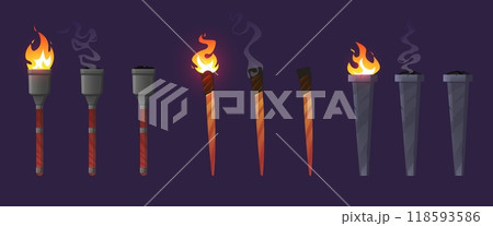 Cartoon torch fading animation. Burning and extinguished medieval castle lamps. Ancient light sources with flame. Smoldering wooden sticks. Old blazing flambeaus. Game icons vector set