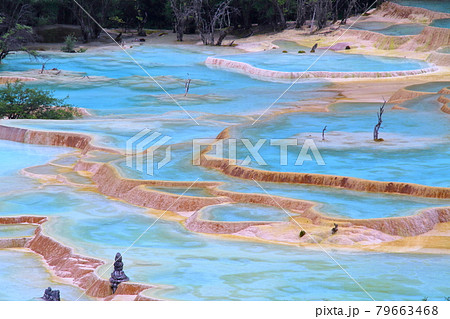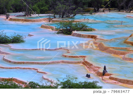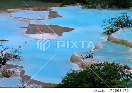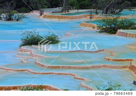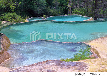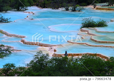 中国四川省アバ・チベット族チャン族自治州松潘県 世界自然遺産黄龍風景区石灰棚の鮮やかな青い水