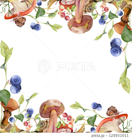 Russula webcap bolete slippery jack mushroom, snail on cap, cranberry blackberry on autumn leaves pile, berries twigs. Square border frame hand drawn in watercolor. Forest floor fungi label tag design