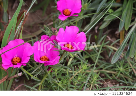 夏の庭に咲く濃いピンク色のマツバボタンの花