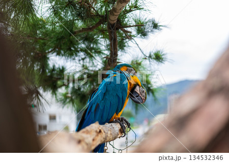 松樹下的琉璃金剛鸚鵡:鮮豔羽翼與五彩繽紛的自然特寫
