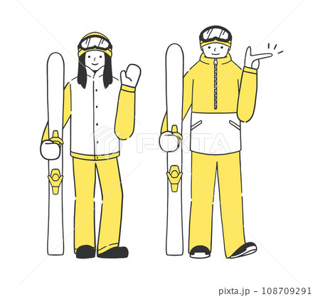 スキーの板を持った男女のスキーヤーの全身イラストセット